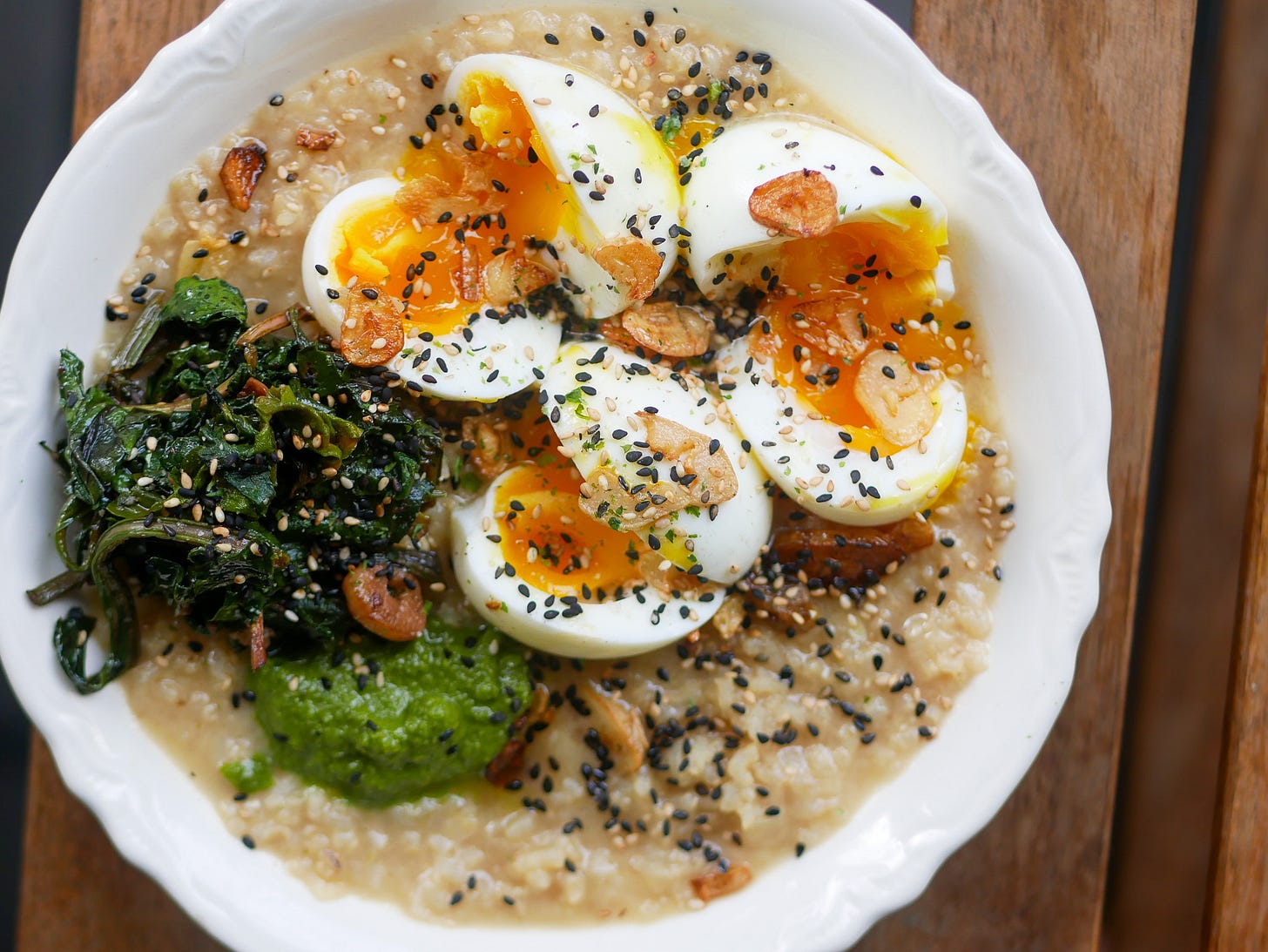 Versions I’ve made: chocolate congee with dates, walnuts, and maple syrup. Turmeric and ginger congee with charred scallion salsa. Bone broth congee with beet greens, fried garlic, cilantro jalapeno salsa, and jammy eggs (pictured below). Shepherd’s pie congee, which was my British take on congee with beef.